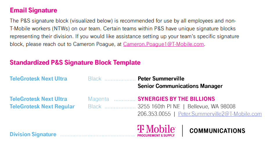 Even an email signature must be branded and consistent. Of course, it also has to make sense. Vital contact info, a tagline highlighting overarching SLT initiatives, and your place in the company in a nice, clean package.